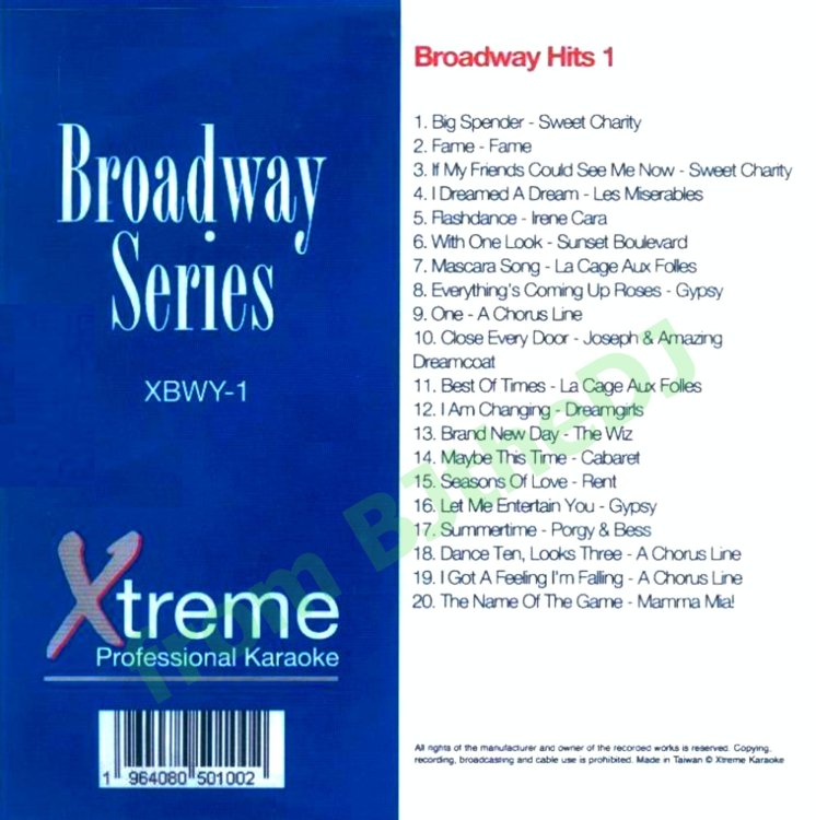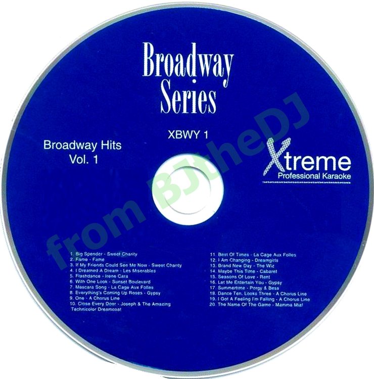 Xtreme Karaoke. Broadway series.. Disc One.. XBWY01 <<Click to Download Track Listing: XBWY01-01 - La Cage Aux Folles - Hey Big Spender XBWY01-02 - Fame - Fame XBWY01-03 - Sweet Charity - If My Friends Could See Me Now XBWY01-04 - Les Miserables - I Dreamed a Dream XBWY01-05 - Irene Cara - Flashdance XBWY01-06 - Sunset Boulevard - With One Look XBWY01-07 - La Cage Aux Folles - Mascara Song XBWY01-08 - Gypsy - Everything's Coming Up Roses XBWY01-09 - Chorus Line - One XBWY01-10 - Joseph - Close Every Door XBWY01-11 - La Cage Aux Folles - Best of Times XBWY01-12 - Dreamgirl's - I Am Changing XBWY01-13 - Wiz - Brand New Day XBWY01-14 - Cabaret - Maybe This Time XBWY01-15 - Rent - Seasons of Love XBWY01-16 - Gypsy - Let Me Entertain You XBWY01-17 - Porgy & Bess - Summertime XBWY01-18 - A Chorus Line - Dance Ten Looks Three XBWY01-19 - A Chorus Line - I Got a Feeling I'm Falling XBWY01-20 - Mamma Mia - The Name of the Game