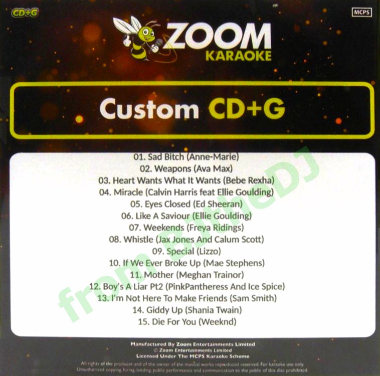New Pop Chart Picks from Zoom Karaoke Zoom Pop Chart Picks ZPCP2023 pt2 <<Click to Download [ATTACH type=full" width="415px]1799[/ATTACH] Track Listing: ZPCP2023-2-01 - Anne-Marie - Sad Bitch ZPCP2023-2-02 - Ava Max - Weapons ZPCP2023-2-03 - Bebe Rexha - Heart Wants What it Wants ZPCP2023-2-04 - Calvin Harris & Ellie Goulding - Miracle ZPCP2023-2-05 - Ed Sheeran - Eyes Closed ZPCP2023-2-06 - Ellie Goulding - Like a Saviour ZPCP2023-2-07 - Freya Ridings - Weekends ZPCP2023-2-08 - Jax Jones & Calum Scott - Whistle ZPCP2023-2-09 - Lizzo - Special ZPCP2023-2-10 - Mae Stephens - If We Ever Broke Up ZPCP2023-2-11 - Meghan Trainor - Mother ZPCP2023-2-12 - PinkPantheress & Ice Spice - Boy's a Liar p2 ZPCP2023-2-13 - Sam Smith - I'm Not Here to Make Friends ZPCP2023-2-14 - Shania Twain - Giddy Up ZPCP2023-2-15 - The Weeknd - Die for You
