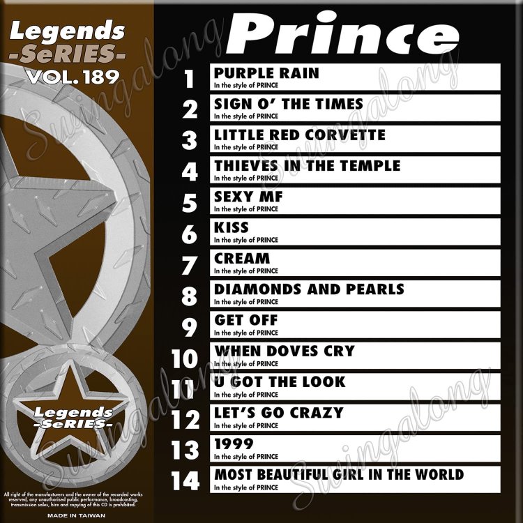 LEG189 - Prince Looks to have a bad listing everywhere I look. KSLC lists 15 tracks, with Alphabet Street as #13, but all disc copies that I've found have this as Cream (as well as track #7 being Cream as well). Found a back cover on Amazon at HERE which lists only 14 tracks, same with an eBay listing at eBay and a listing at Session Music as well. So unless somebody has a Legends version of "Alphabeat Street" I suggest that you all modify your discs.